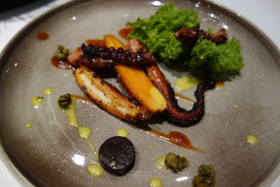 Zatim su nam, premda nismo naručili, donijeli pikantni ragu od sipe s palentom koji je veliko i snažno, jako zasitno jelo, pa ga zapravo možda ne bi trebalo stavljati u degustacijski meni s kojeg je došao na naš stol. Među glavnim jelima posebno se neodoljivim pokazao pečeni oslić s hrskavom koricom, mousseom od krumpira i coulisom od paprika; oslić je jedna od najslasnijih i najvrednijih naših riba, koju vrlo malo restorana ispravno valorizira. Carpaccio od zubaca herojski je podnio društvo aromatičnog umaka od maracuje: carpaccio smo naručili da bismo provjerili greške, jer smo bili gotovo uvejreni da će passion fruit uništiti sirovog zubaca.