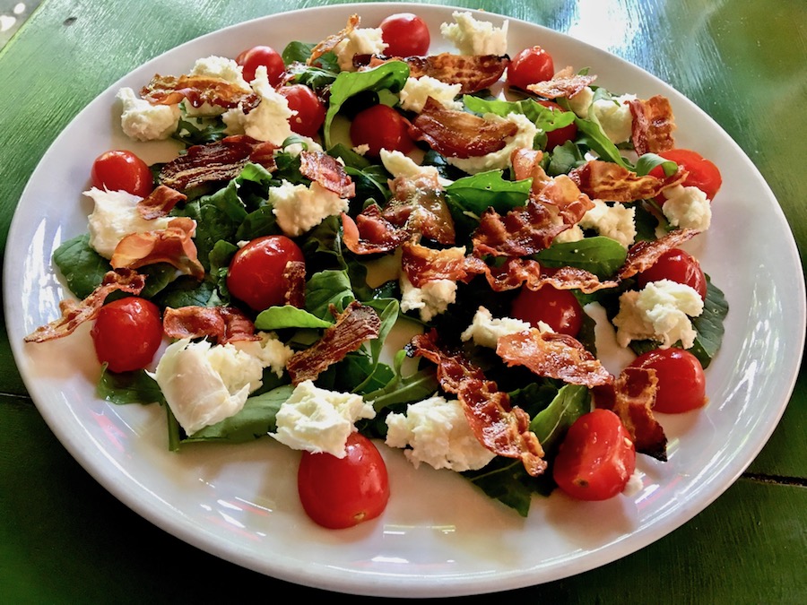 Te su salate među najjednostavnijima, ali i najboljima u gradu, kad je riječ o posve jednostavnim jelima za ručak. Salata u kojoj smo uživali u dubokom hladu Karijoline terase, sastojala se od izvrsne, gorke i pikantne rukole, puno natrganih komada buffalo mozzarelle, korektnih cherry rajčica i savršeno hrskave pancete.