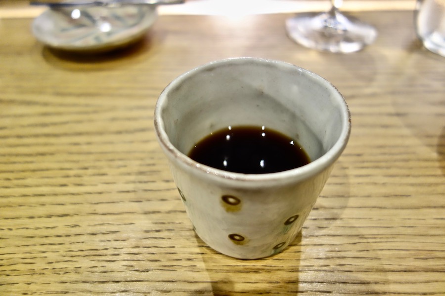 Večera u Tokuyoshiju počinje šalicom toplog, koncentriranog temeljca od povrća, koji se dobiva 48 satnim iskuhavanjem korjenastog povrća. Temeljac na kraju ima boju crne kave i duboke, slatke umamizirane okuse. Ovaj nas je couvert podsjetio na njujorški Kajitsu, restoran stare budističke kuhinje za koju su karakteristični suzdržani ili čisti ali duboki, kompleksni okusi.