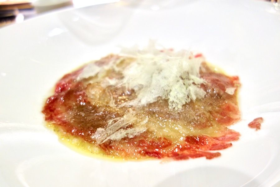 Rižoto od kamenica s wagyuom apsolutno je najspektakularnija stvar koju smo kušali u subotu navečer. Tanak sloj savršeno skuhanog rižota prekriven je širokim trakama sirove wagyu govedine. Treći snažan okus ovom genijalnom jelu dalo je zeleno maslinovo ulje, koje je okruživalo rižu, dok je šalica soka od zelenih jabuka svojom svježinom rezala masnoću rižota. Ovaj rižoto je eterično mineralan, s divnim, bogatim okusom kamenica koji, međutim, ostaje nježan, s jedne strane podignut voćnim okusima ekstradjevičanskog maslinova ulja a s druge zaokružen raskošnom masnoćom i slatkoćom wagyua, tako da imate osjećaj da jedete nešto tako lagano da lebdi.