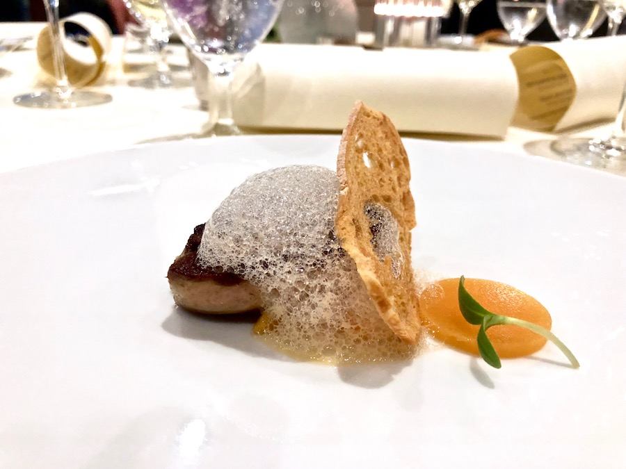 Zatim smo uz sashimi od zubaca s ukiseljenim povrćem pili traminac iz 2014. bogat, cvjetan i svjež, iz linije Classic. Uz foie gras s diskom od marelice i pjenom od citrusa poslužen je ekspresivni, bogati,masni sivi pinot Grosse Laue iz 2011. godine koji se zadovoljno složio s gusjim jetrima.