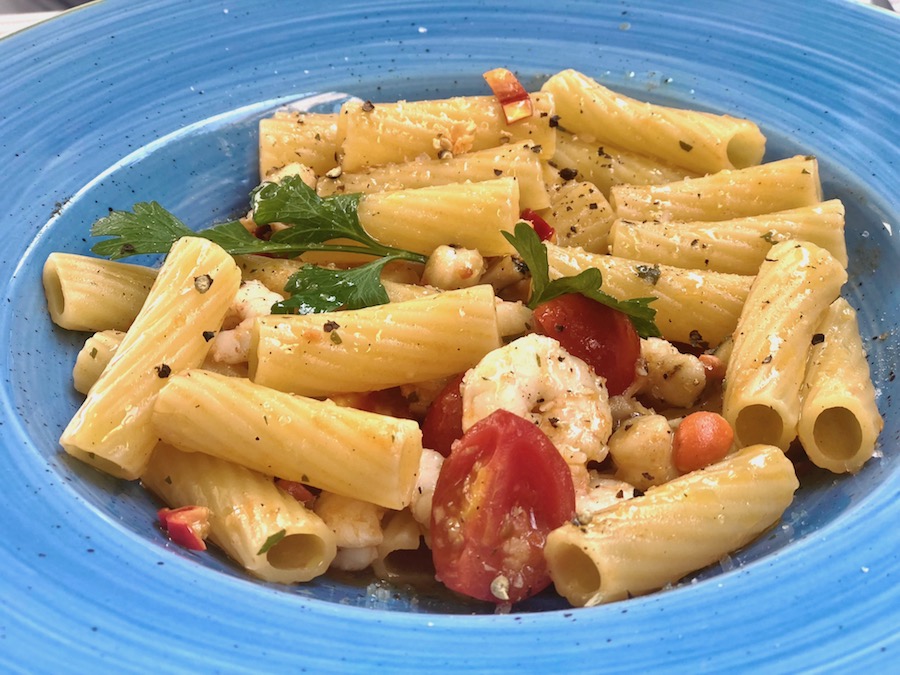 Rigatoni s kaneštrelama, malim kozicama i malim rajčicama, profitirali su sa svježim habañerom što ga je konobar ubrao iznad našeg stola, iz reda velikih tegli s visokim granama svih mogućih čili papričica. Premda je ovo jelo bilo skladno i ukusno, i premda su rigatoni bili precizno skuhani, čvrsti točno koliko treba, ne bi bilo loše da su ih završili s par listova svježeg bosiljka: cijeli bi tanjur dodatno zamirisao i atraktivnije izgledao.