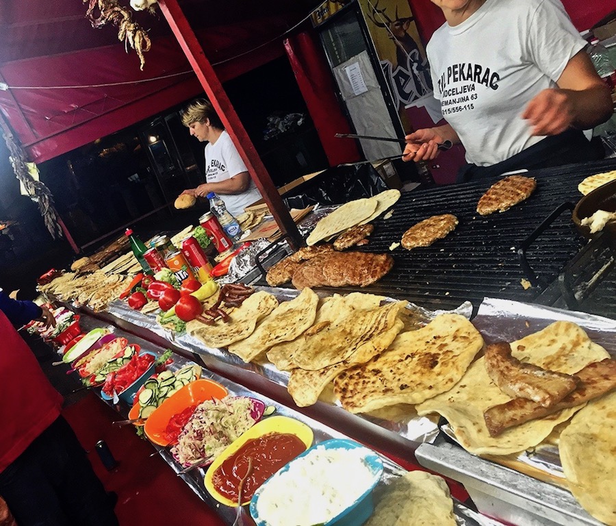 Stali smo u red na jednom od štandova. Na rubu stola najbliže nama, ispred roštilja u velikim je zdjelama stajalo milijun priloga: sve vrste paprika, luka, paradajza, raznih sireva. Nema nijednog industrijskog proizvoda i nijednog tipičnog fast food dodatka. Svo povrće je svježe i domaće, stalno se reže i prodaje. Umaci, uglavnom ajvari i pinđuri, izgledali su jednako dobro. Kad sam došao na red, vidio sam da kuhar po susjednom roštilju posipa Vegetu. Iz zafrkancije sam mu rekao da neću hrvatski začin. Pogledao me i izvadio nešto ispod stola: “Za vas Hrvate imamo začin C.” Posuo ga je po roštilju smijući se: “Šta oćeš? Sve je friško”.