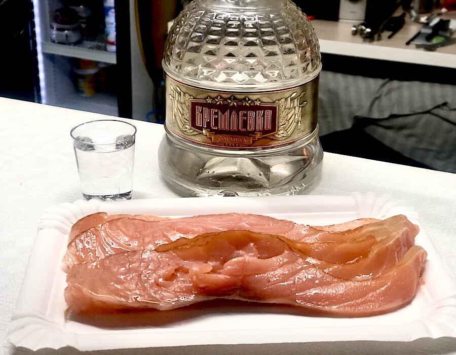 Rasputin šašlik radi od svinjske vratine koja mariniranjem dodatno omekšava pa je meso izrazito sočno, pikantno i ukusno. Dimljeni losos s Kamčatke prodaju u malim sendvičima od brioš peciva ali mi smo zamolili da nam narežu sami losos, koji je bio odličan, debelo rezan, s dosta jakim, malo stršećim okusom dima, vjerojatno toplo dimljen.