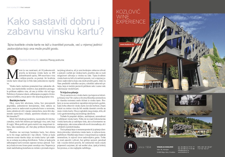Tko je sastavio ovu vinsku kartu i po kojem su kriteriju birana vina? Jer cijela se životna filozofija sommeliera ili vlasnika restorana može iščitati iz vinske karte. Pro- ljeće je za nas sommeliere najzahtjevniji period u godini, kada treba obnoviti vinsku kartu novom berbom. Znam kušati na stotine vina da bih možda desetak uvrstila na moju vinsku kartu. Ona je ogledalo mog znanja, stila, ali i eno-gastronomskog nacionalnog identiteta.