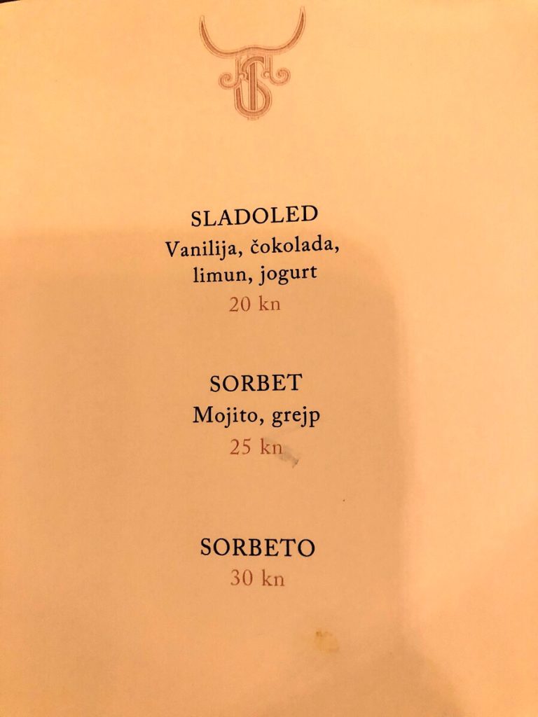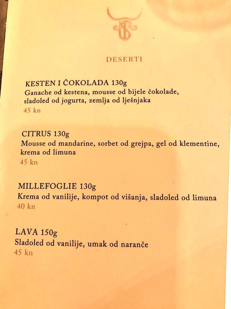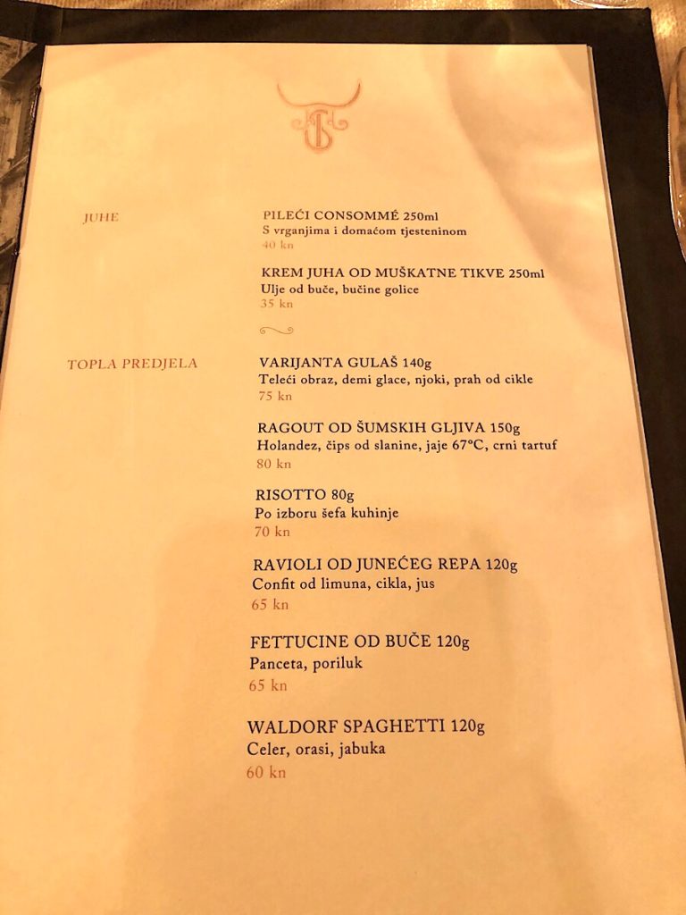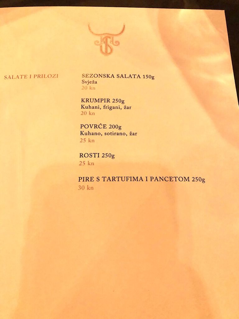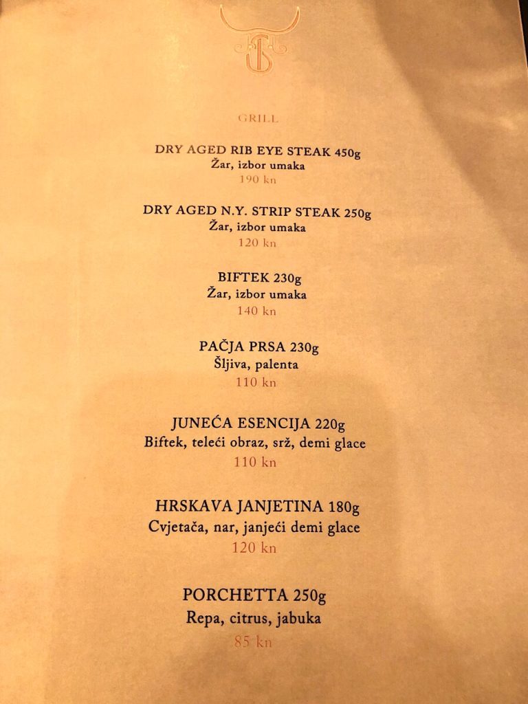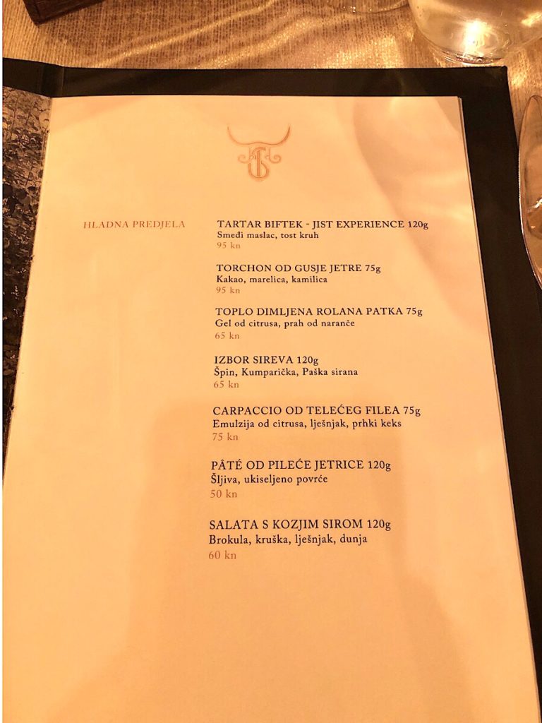 Jistov meni nije velik, i sav je dosljedno fokusiran na meso: od tartar bifteka, preko telećeg carpaccia i raviola punjenih goveđim repom, do velikog ribeyea (oko 450 grama), normalnih bifteka, New York Stripa, jela koje se zove goveđa esencija, te naposljetku porchette i hrskave janjetine, da baš sve ne bi bila govedina.