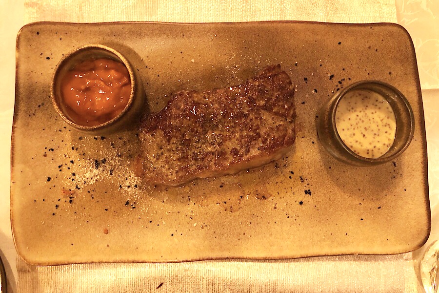 Naš je bio perfektno pečen, crvenkast iznutra, ali je svejedno ostao lagano žilav, što upućuje na problem s dobavljačem mesa, ali i na strateški problem domaće mesne industrije: jedini uvijek i sigurno mekani domaći steak jest biftek.