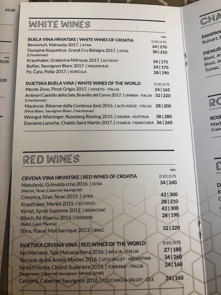Vinska karta je kratka, u nekim segmentima atraktivna u drugim supermarketska, ali su cijene skoro senzacionalne. Sve se toči na čaše, pa tako Bolfanov Sauvignon i Benvenutijevu Malvaziju možete dobiti za 24 kune što je vjerojatno najniža cijena tako dobrih vina bilo gdje u centru Zagreba. Jako fina Matoševićeva crna Grimalda toči se za 34 kune, a Coronicin Gran teran, koji se skoro nigdje ne prodaje na čaše, u A Postu košta 42 kune.