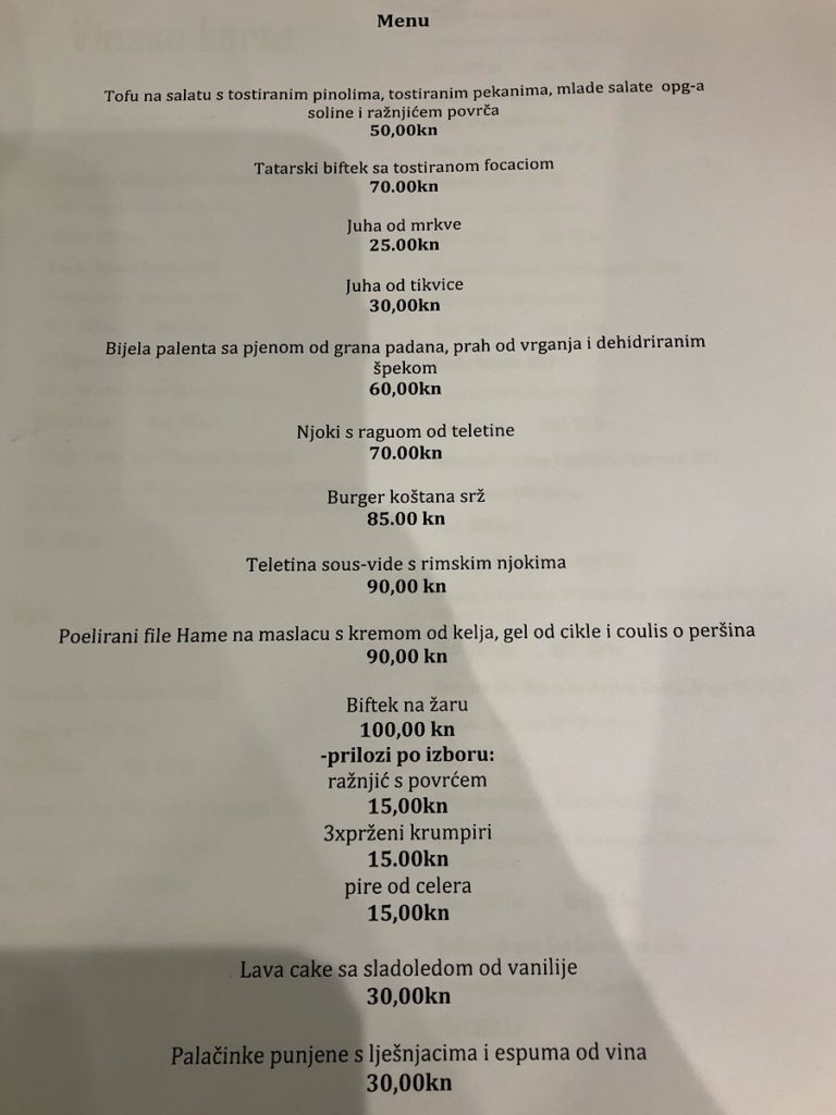 Meni obuhvaća jednu tipičnu zimsku juhu, od mrkve, pa jednu ljetnu juhu, od tikvica, koja, međutim, sjajno funkcionira u zimskim uvjetima, pa tartar biftek, pa teleći ragu, pa hamu, koju domaći restorani tko zna zašto gotovo uopće ne koriste, pa burger s moždinom, te na kraju bifteke s raznim prilozima. Prilozi se posebno naplaćuju, što je normalno s obzirom na diskontnu cijenu steakova.