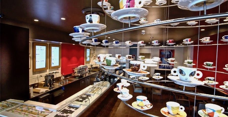 Na samom ulazu u sjedište kompanije, iznad šanka oko kojeg se stalno okupljaju gosti i illyjevi zaposlenici odjeveni u crveno, spiralno se uzdiže desetak metara malih šalica. Svaka šalica dio je illyjeve umjetničke zbirke, utemeljene na suradnji s poznatim talijanskim i svjetskim umjetnicima. Dok vas budi miris svježe kuhane kave, gledate minijaturne radove Juliana Schnabela, Roberta Rauschenberga, Pistolettove šalice, intervencije Marine Abramović.