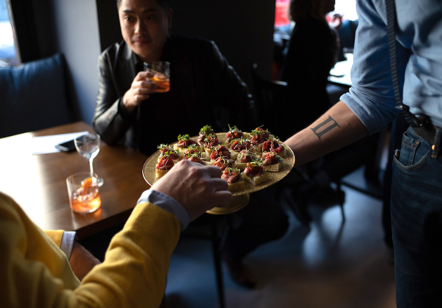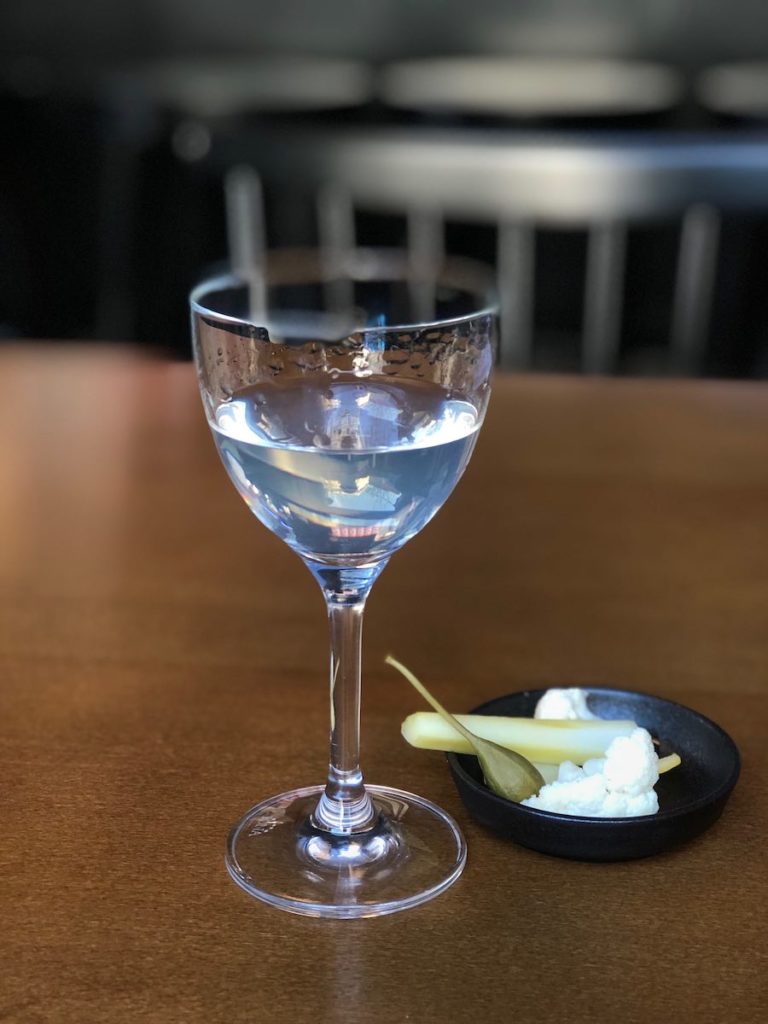 Barmeni u A Postu prvo su nam napravili Martini s Lufrbremzerom i Mulassanovim suhim bijelim vermutom. Martini nije bio jako suh, i mogao bi proći kao prvo piće u danu, posebno s ukiseljenim kaparima i karfiolom koje su poslužili uz njega umjesto maslina. Luftbremzer se puno boljim pokazao u Negroniju, opet s elegantnim Mulassanovim crvenim vermutom i biterom, koji nisu zamaskirali mekoću gina pa smo dobili lakši, citrusniji, još uvijek dovoljno aromatičan Negroni idealan za ljetni aperitivo na visokim temperaturama.