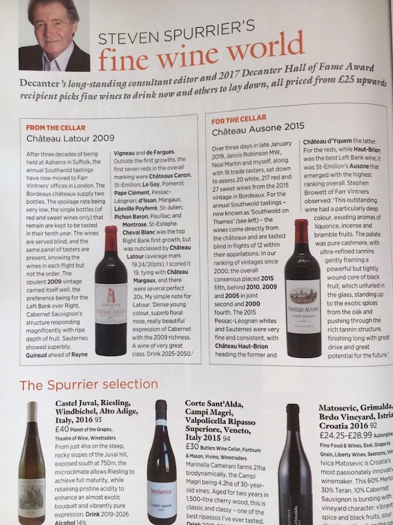 “Osjećam se kao da sam igrao s Curryjem i LeBronom,” rekao nam je jutros Ivica Matošević, komentirajući kolumnu Stevena Spurriera u Decanteru od ožujka. Naime, u svojoj redovitoj rubrici Fine Wine World, jedan od najutjecajnijih svjetskih vinskih kritičara piše o Château Latouru iz 2009. i Chateau Ausone iz 2015. Dakle, o dva vina koja spadaju među najbolja na svijetu, što podrazumijeva adekvatno visoke cijene.