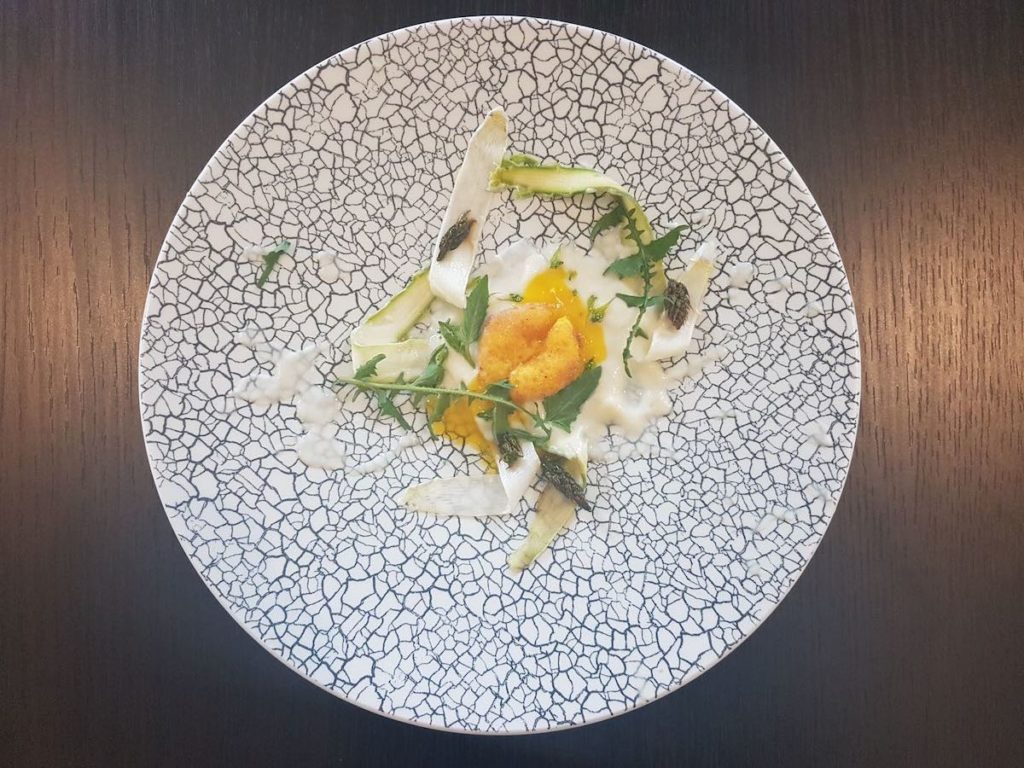Marinirane bijele i zelene šparoge na kremi od bijelih šparoga, prženo jaje i marinirani bljušć