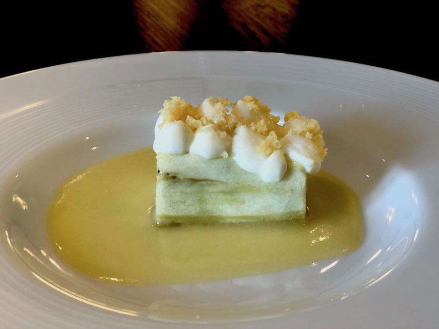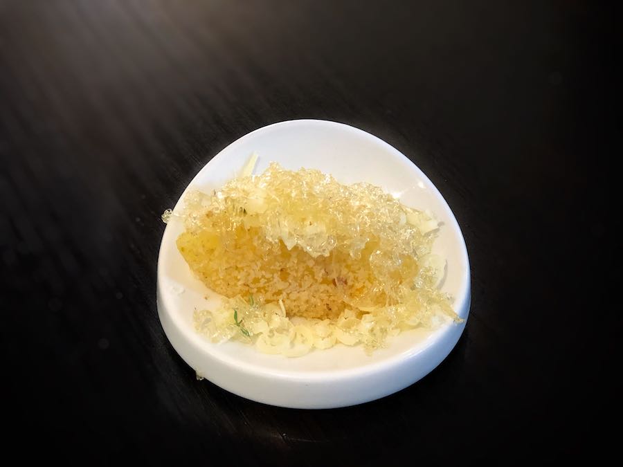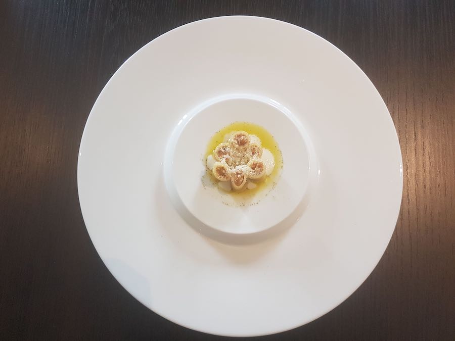 Jabuka se kuha u jednostavnom sirupu s korijanderom, zatim se uvalja u mljevene orahe i pospe ribanim gelom od meda s agar agarom. “Evo o čemu pričam, ” rekao je Scarello sjedajući za stol i pažljivo stavljajući ovaj mali ljupki tanjur pred sebe. “Jabuka me uvijek asocira na djetinjstvo. I to moram poštovati. Namirnica, hrana općenito, valorizira se i kroz sjećanja i emocije, taj se aspekt ne može precijeniti”.