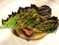Proljeće je sletjelo i na tanjur s pečenom divljom oradom, koja je uživala u društvu dehidriranog mladog češnjaka i pečenog lista medvjeđeg luka. Prilično je impresivno kada jelo koje sadrži dva elementa od češnjaka (medvjeđi luk je zapravo češnjak ) ni malo ne zaudara po češnjaku, nego je puno njegove herbalne slatkoće.