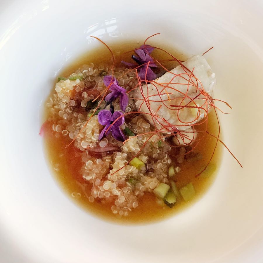 Kako sve ne bi bilo isključivo lokalno, ukiseljene su se šparoge našle u društvu dashija i kvinoje, s kockom jako ukusne, gotovo slatkaste konfitirane palamide.