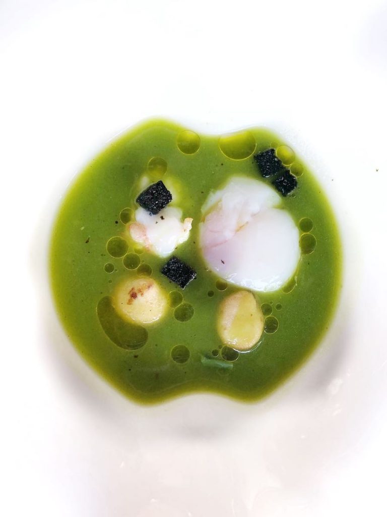 Duboko zelena juha od šparoga s repom škampa izvrstan je primjer proljetnog Kvarnera u tanjuru: njena je tekstura postala svilenkasta zahvaljujući perfektno poširanom jaju (ispravno poširana jaja još su rijetkost u većini hrvatskih restorana).