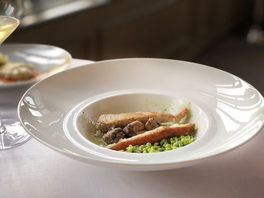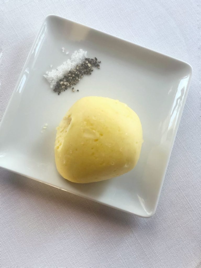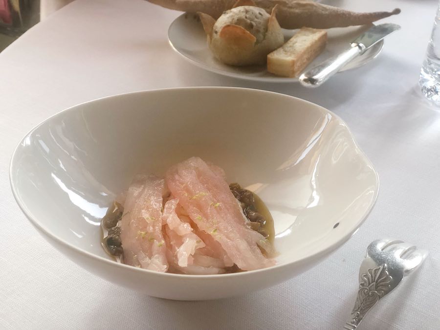 Prije predjela gosti još dobivaju očekivano izvrsnu selekciju kruhova; osobito nam se dopao hrskavi kruh od lisnatog tijesta, koji se fantastično složio s gustim zlatnožutim nepasteriziranim maslacem iz Bretanje. Puni tanjurići kruščića i velika orošena kugla maslaca s dvije lajne soli i papra, Ledoyenov su način da vas nahrane i oraspolože prije nego što stigne bilo što od onoga što ste naručili. A ono što smo naručili pretvorilo se, definitivno, u našu najbolju večeru unatrag osam godina.