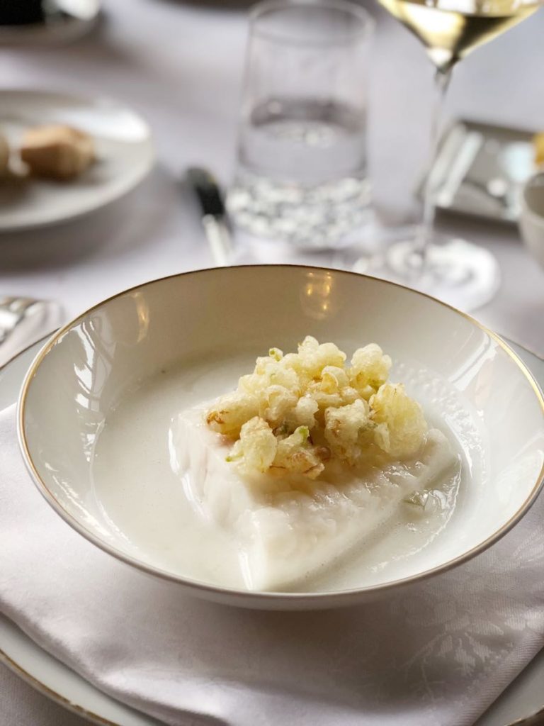 Debeli poširani file ivera kakav se reže od velikih primjeraka ove ribe, podsjetio nas je zašto su Escoffier i Pellaprat kovače i škrpine smatrali gastronomski osrednjim vrstama. Bio je to najbolji riblji file naše novije prošlosti; elegantan, prozračne, sočne, svilene teksture i dugog kompleksnog okusa. Iver poslužuju u bijelom umaku od narančina cvijeta, s hrskavim cvjetovima jasmina napravljenima kao beigneti. Kao protutežu eleganciji, lakoći i čistoći ivera i cvijeća, dobili smo stabljike zelenih šparoga umotane u Lardo di Colonnata koji ručno režu kraj stola. Osim larda tu je još bio i puding od repe. Jedno se jelo tako pretvorilo u tri tanjura.