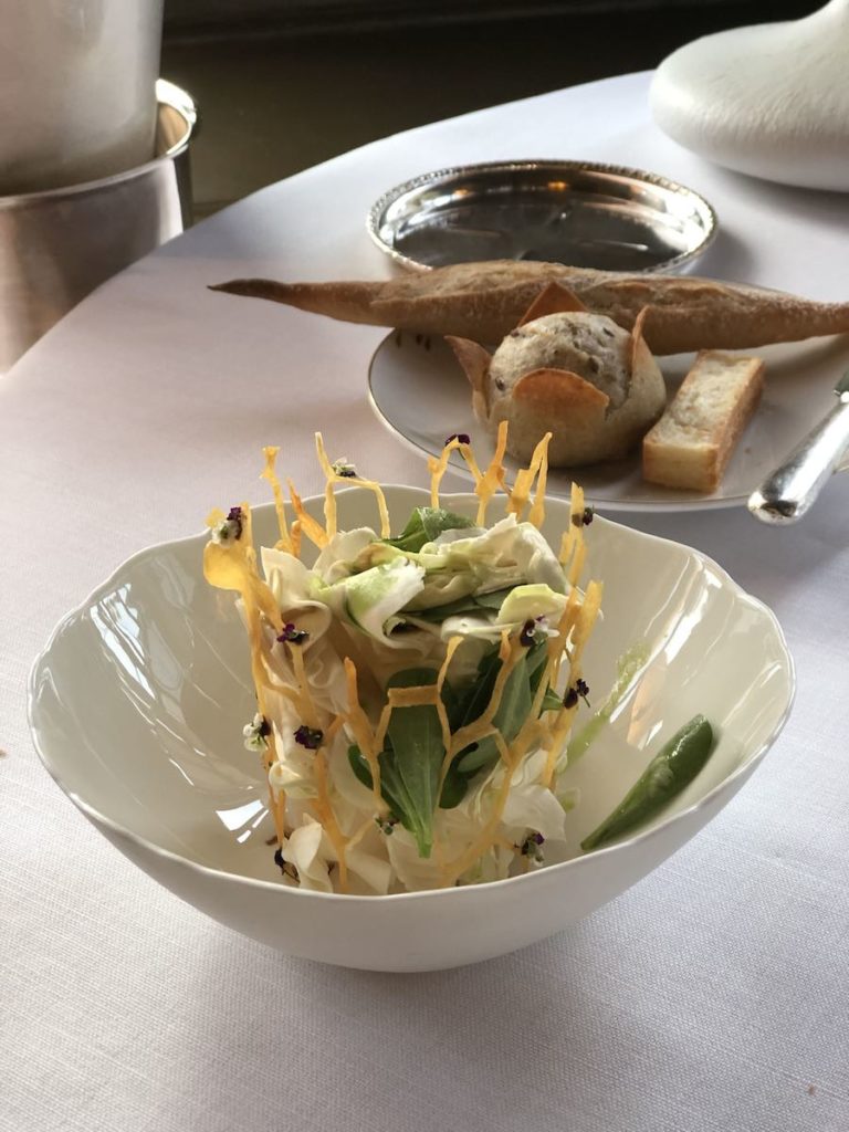 Poslije šampanjca na stol dolaze pozdravi iz kuhinje: kanape od topljene ljutike s prahom od govedine servirane na velikoj goveđoj kosti, rolice od škampa i intenzivnog kozjeg sira s mirisom ruže na kombu algi i marshmallow od mimolettea, bogatog zrelog sira iz Lillesa čija se povijest tumači kao francuski odgovor na nizozemski edamer. Večera se naručuje uz amuse bouche.