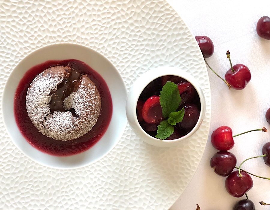 Trešnje ukuhajte sa smeđim šećerom, vanilijom i cimetom. Smjesu stavite u vrećicu za ukrašavanje i napunite kalupe do pola. Dodajte 1 žlicu ukuhanih trešanja da napunite kalupe do kraja. Pecite 5 minuta na 200 stupnjeva. Preostale ukuhane trešnje sameljite u blenderu. Na tanjur stavite 2 žlice umaka, kolač i dovršite šećerom u prahu.