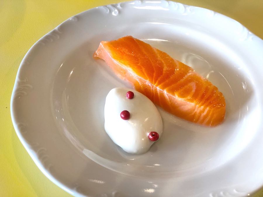 Macchi i Mladen Rožanić, vinar i vlasnik vjerojatno najoriginalnijeg istarskog hotela, dugogodišnji su prijatelji. Francuski chef piše recepture, educira osoblje i povremeno sam kuha, dok ne dođe stalni glavni chef, koji bi trebao stići iz inozemstva. Jučer smo, uz pljusak i fantastične poglede na zelena brda prema Vižinadi, prvo probali u kući napravljeni gravlax, koji je teksturom i okusom podsjetio na čuveni balik. Prvorazredni svježi losos dolazi u restoran iz Škotske, gdje ga Macchi obrađuje bez dimljenja. Rezultat je izvanredan.