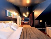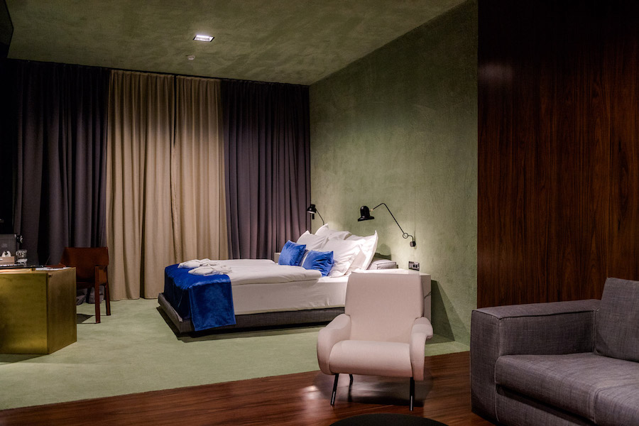 Soba 205 u Roxanich Wine & Heritage Hotelu ispod Motovuna jedna je od najoriginalnijih koje smo ikada igdje vidjeli. Krevet je visok, sav u smeđoj koži, sa širokim ljestvama koje vode do kreveta na katu. Možete, dakle, spavati na gornjem ležaju ispod teških drvenih greda, jednog od elemenata sačuvanih iz starog komunalnog vinskog podruma na kojemu je hotel izgrađen, ili na donjem ležaju ispod velikog ogledala. Premda zvuči ekscentrično, osjećaj je zapravo jako ugodan, čemu pomažu fenomenalni madraci i jastuci, i cijeli feeling sobe. Duboka niša prozora uokvirenih škurama, otvara se prema motovunskim vinogradima.