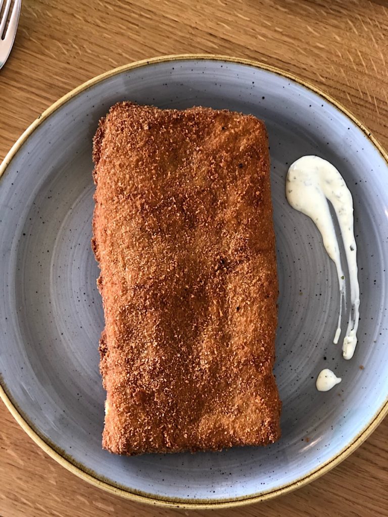 Zagrebački, na kojem je Ribič nastao, zapravo nije osobito dobar. On jest propisno pohan, s ujednačeno hrskavom korom, ali teletina koju smo dobili imala je žilice, dok su sir i šunka posve bezokusni. Okej, znamo da bi im korištenje gruyerea uništilo financijsku konstrukciju, ali bi svejedno trebali pronaći nešto karakterniji sir, pogotovo sada kad su se odrekli imidža narodne seoske gostionice u korist ambiciozne, premda posve nejasne orijentacije.