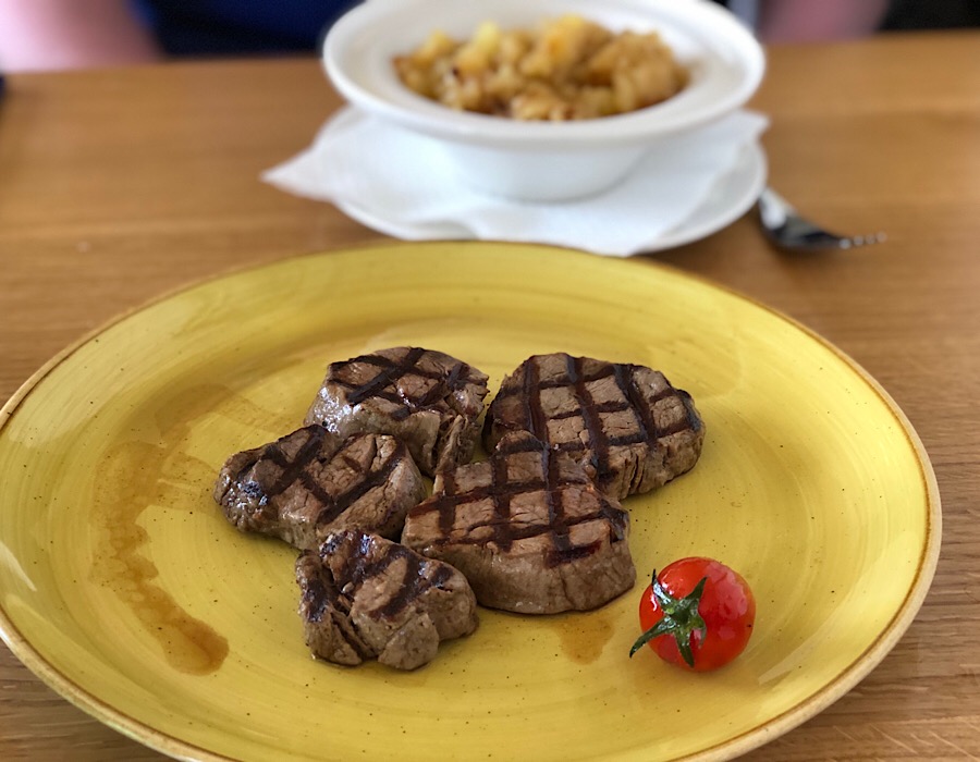 Teleći medaljoni u umaku od šampinjona (130 kuna) bili su mnogo, mnogo bolji. Iako je kuhinja malo prepekla meso, ono je ostalo donekle sočno, s finim okusom Maillardove reakcije. Restani krumpir bio je  doslovno perfektan, baš kao i pozdrav iz kuhinje: mekana zlevka s gustim ukusnim vrhnjem.