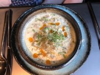 Uz fantastičan nigiri, dobili smo i jako dobar gunkan s kremastim tartarom od škampa. Prije škampa serviran je prvorazredni sashimi od otora i chutora Kali tune, a poslije još jedno jelo, koje je naše prijatelje iz Francuske prilično fasciniralo: ovaj se put nije radilo o skupom škampu, nego o skromnom zapečenom patlidžanu s misom i mirinom, malim kozicama i paškim sirom. Cijeli je tanjur prštao od umamija.
