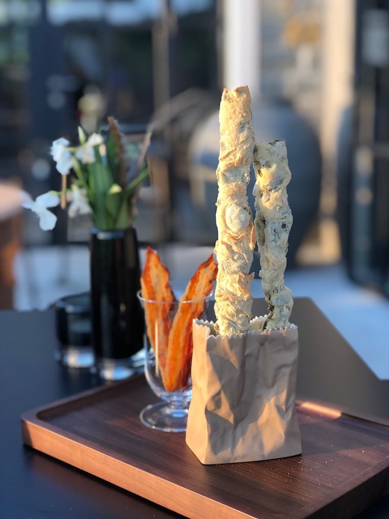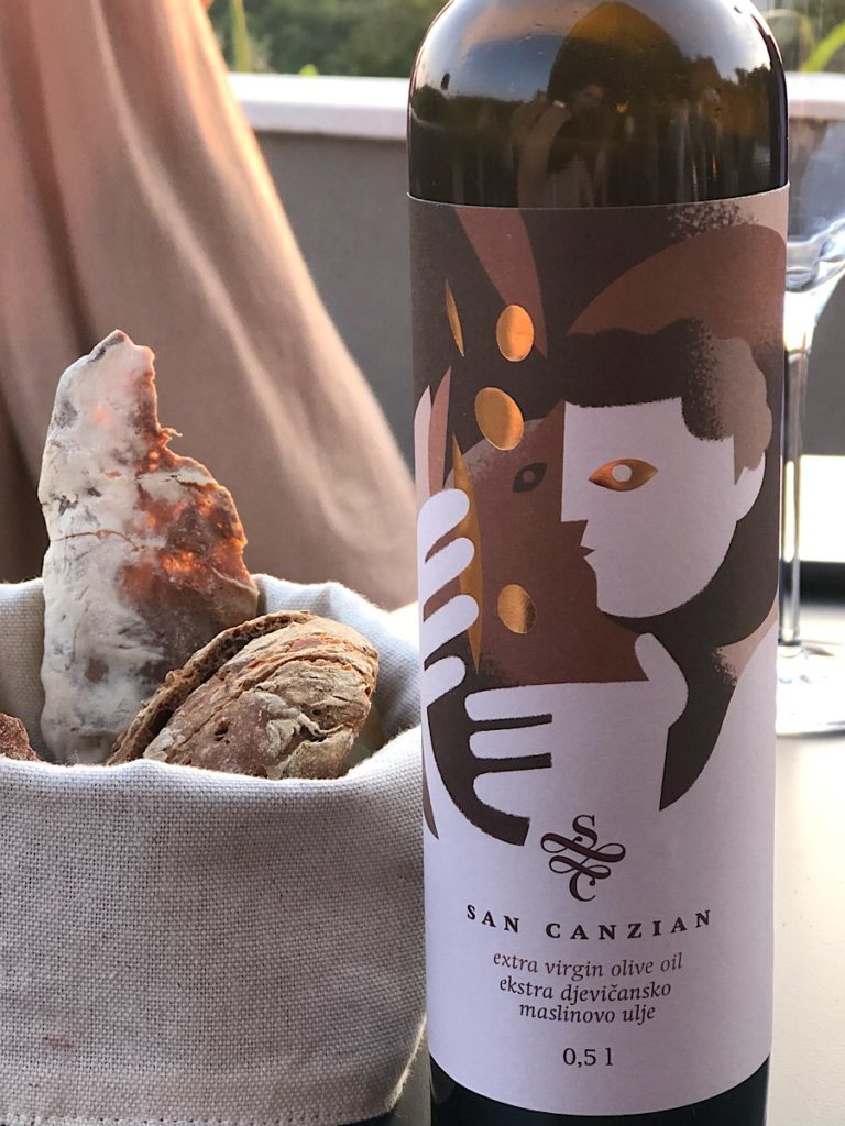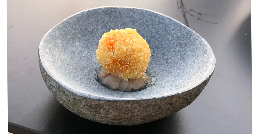 Prva gala večera u Noelu Buje počela je za barom, izvrsnim koktelom Karla Ferenčaka, koji se bazirao na crnim Jamesonu infuziranom korom neke obližnje smokve, s divljom kamilicom. Kad smo se spustili u restoran, dočekali su nas magnumi Kabolina pjenušca Re, par finih vrsta domaćeg kruha i San Canzianovo prilično pikantno ulje. Pozdrav iz kuhinje, pohana kuglica brudeta od brancina poslužena na mariniranom brancinu, bila je hrskava i aromatična premda malo prevelika.