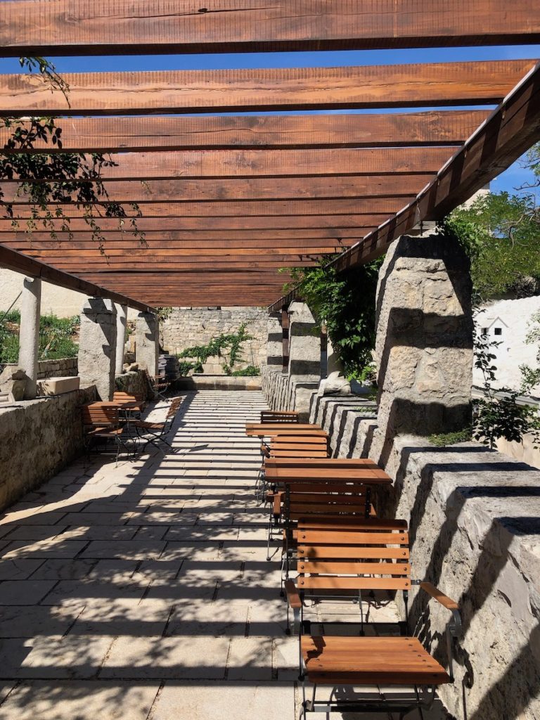 Za doručak, koji se poslužuje na spektakularnom metalnom stolu iznad antičkog kamena za prešanje maslina, uz standarde poput kroasana i jaja od kokoši Hrvatica koje vlasnici sami uzgajaju, svako jutro poslužuju topli domaći kruh pečen u hotelu i nekoliko lokalnih stvari poput otočkih sireva i bračke torte hrapoćuše.