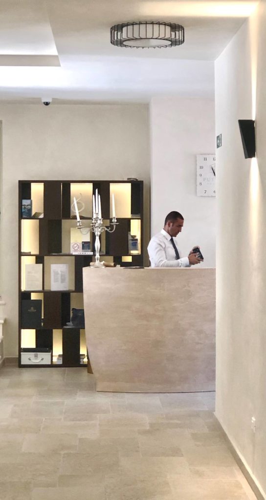 Puteus Palace stari je kameni kompleks, koji počinje Wine Barom, odmah iza glavnog uličnog ulaza. Recepcija je smještena na polukatu, tako da gost mora proći kroz dio glavne hotela da bi došao do recepcije. Ovo je važno, zato što mnogi moderni luksuzni butikni hoteli u posljednje vrijeme recepciju odmiču od glavnog ulaza, kako bi gostu stvorili dojam da posjećuje privatnu kuću, a ne službenu instituciju na čijoj se porti odmah mora prijaviti i pokazati dokumente.