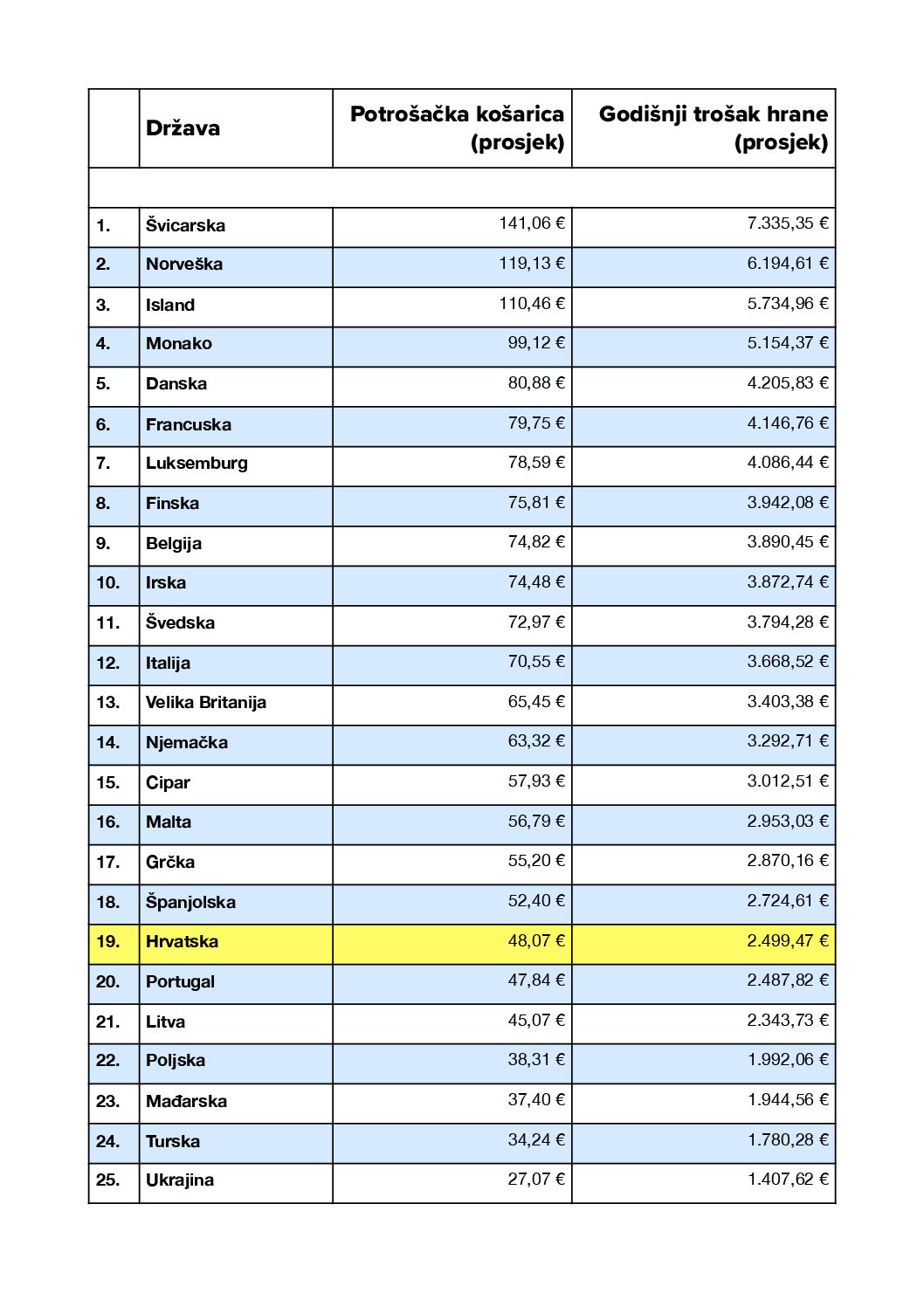 Hrvatska je negdje točno u donjoj trećini. Što demantira opće domaće uvjerenje da je hrana u Hrvatskoj skupa. Osnovne namirnice, pa čak i restorani u Hrvatskoj jeftini su u odnosu na cijene u razvijenim europskim zemljama. Hrvati nažalost ne mogu podnijeti ni takve cijene, jer imamo očajnu kupovnu moć, a to je već sistemsko ekonomsko pitanje, koje ne pogađa samo kupce već i domaće proizvođače hrane, koji ne mogu postići cijene dovoljne za profitabilno poslovanje. No, trend rasta cijena ne zaobilazi ni nas. U srpnju 2019. hrana je bila skuplja 0,20 posto nego u srpnju 2018. Inflacija cijena hrane u Hrvatskoj u zadnjih je 13 godina 2,14 posto. Prema Eurostatovim podacima objavljenima u lipnju, Hrvatska je po kupovnoj moći pretposljednja među članicama Europske unije, s 30 postom nižom potrošnjom od EU prosjeka. Lošija je samo Bugarska.