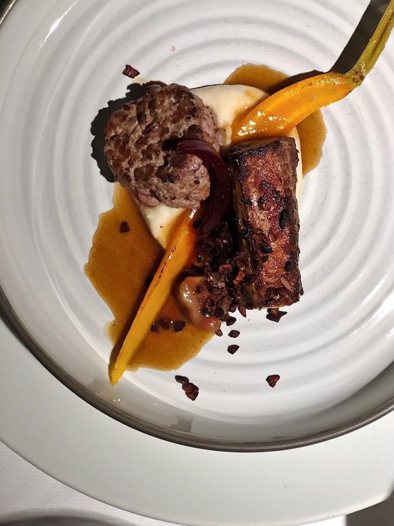 Sličan dojam ostavili su i zapečeni tartar/polpeta od boškarina, s pečenim boškarinovim ligamentima, goveđom moždinom i slatkom mladom mrkvom. Vegetarijanska su jela također bila briljantna. Terina od patlidžana i skute s Dobravčevom svježom rajčicom i Chiavalonovom passatom s par kapi Monteova desetak godina odležanog balsamica, klasični je Monte, s čistim, finim okusima u konvencionalnoj strukturi, dok je pečena zelena papričica na umaku od dimljene paprike, punjena rižom i posuta crumbleom punim toplih začina, ostavljala dojam kao da je stigla iz Hiše Franko ili Nava .