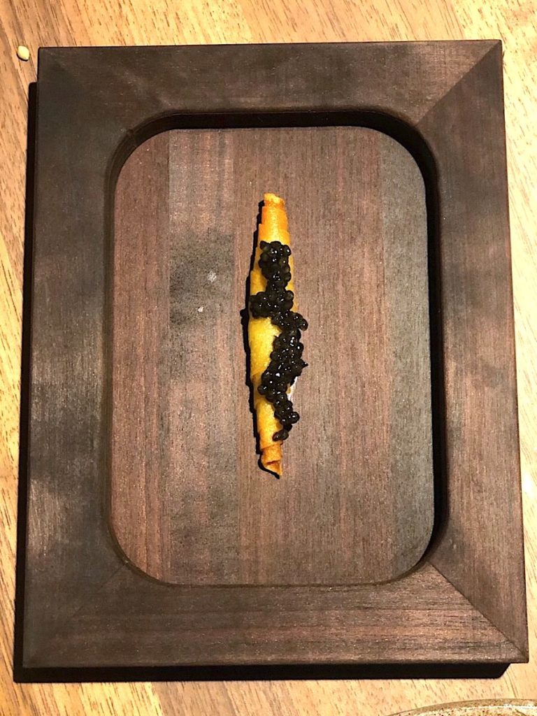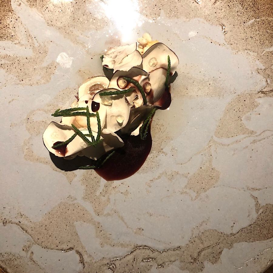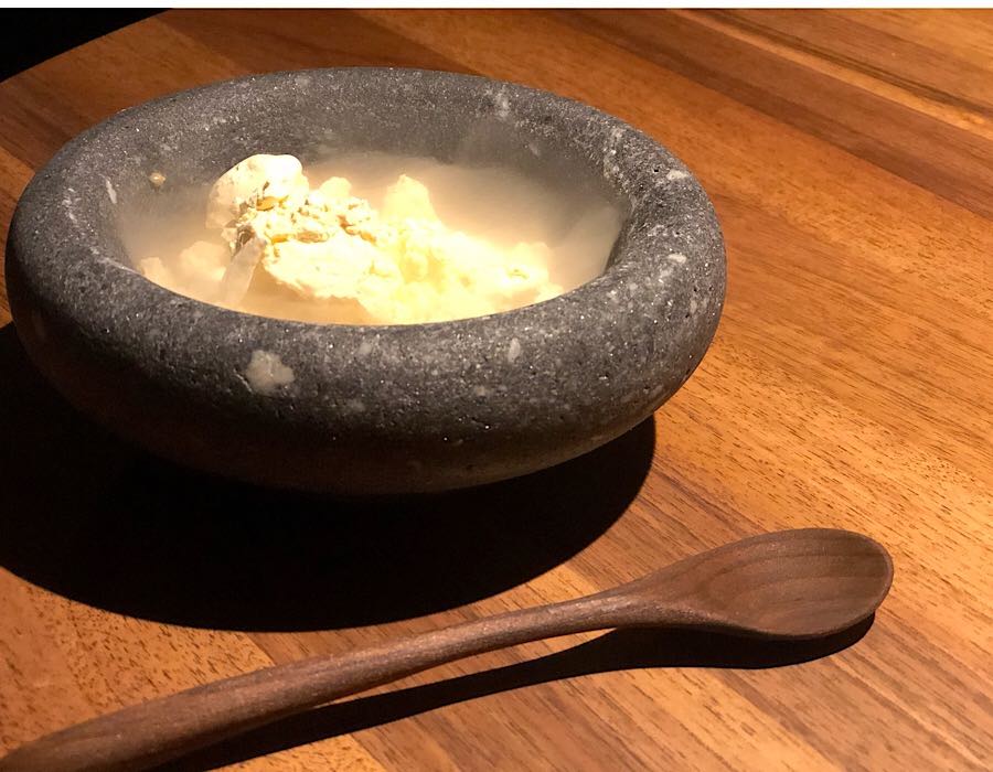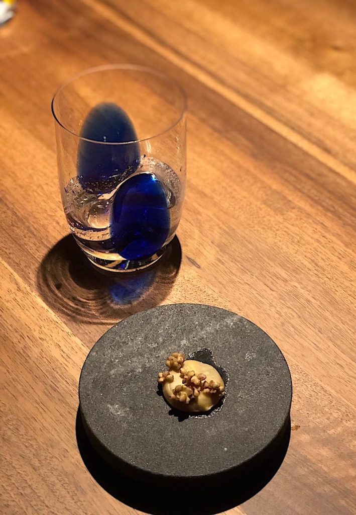 A za desert smo dobili sladoled od goveđe moždine s malinama, karamelom i cvijetom soli koji se, kremast i bogat, izvrsno složio s Joh. Jos Prümovim raskošnim auslese rizlingom, i potpuno neodoljivu kremu od stiltona, kozjeg sira i marelica ohlađenu tekućim dušikom. Dušik ovdje nije zbog vizualnog efekta niti kao podsjetnik na eru molekularne kuhinje, nego siru omogućuje da s neočekivanom hrskavošću dobije novi izraz, i onda se u ustima pretvori u najkremastiju teksturu na svijetu, obogaćenu distinktivnim okusom blue stiltona. Uz veći dio ove impresivne večere pili smo Moretov Rully iz 2015, a uz teletinu Chianti Isola e Olena iz iste berbe.