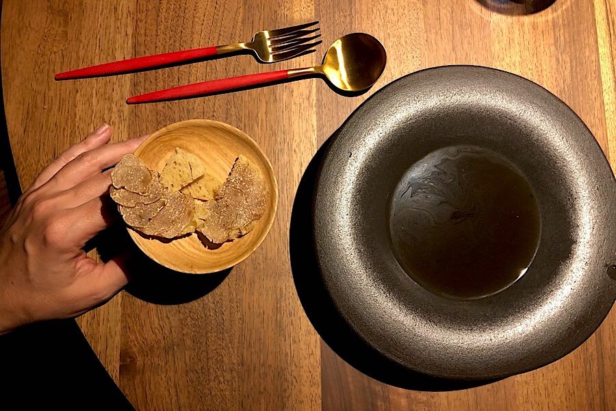 Uzmimo za primjer consomme od šumskih gljiva s hrskavim sourdough kruhom i fetama bijelih tartufa: juha svilenkaste teksture toliko je pročišćena da vas ne napada intenzivnim aromama tipičnim za sve druge juhe od vrganja, nego je prvi mirisni napad prepušten tartufima. No,aftertaste ovog otmjenog consommea traje vrlo dugo i u njemu se jako osjete precizno izvučeni okusi šumskih gljiva.