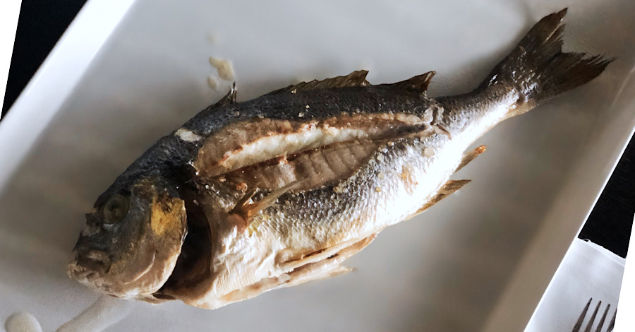 Pa smo izabrali lijepu, otprilike kilogram veliku oradu, koja je bila fenomenalna: meka, sočna i stvarno prepuna okusa. Nažalost, uz oradu su nam servirali krumpir s rajčicama i kaparima prepun češnjaka, premda smo ljubaznom konobaru rekli da bismo željeli izbjeći češnjak ako je to ikako moguće, a on je nama rekao da je to prenio kuhinji. Isto se dogodilo i s pozdravom iz kuhinje.