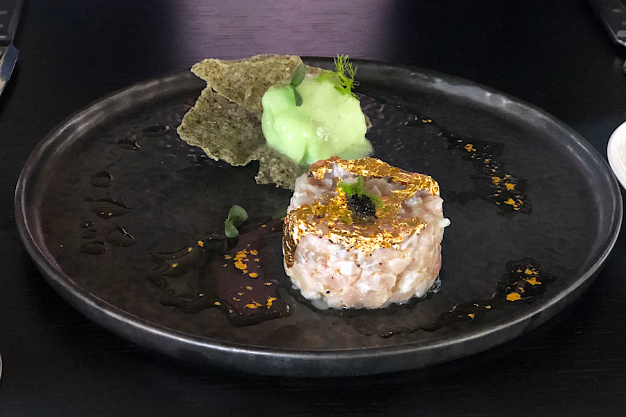 Tako juha od rajčica nije bila crvena nego bistra, s izvrsnim tartarom od škampa. Tartar od brancina bio je obogaćen oscietra kavijarom, ali i nepotrebnim zlatnim listićima, dok je na drugoj strani tanjura poslužen odlični sorbetto od limete. Sekciju pasti i rižota smo preskočili, premda su crni špageti s dondolama zvučali privlačno. Preskočili smo i cijelu sekciju elaboriranih jela od ribljih filea, jer nam se jela svježa, a ne uzgojena riba.