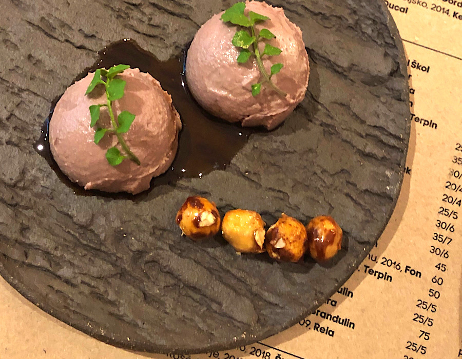 Pašteta od pileće jetre obogaćena je fenomenalnim slano karameliziranim lješnjacima i redukcijom terana. Ljubičasti krumpir s pastrvom i crnim češnjakom dolazi na stol u pratnji čipsa od krumpirove ljuske i umaka od vode u kojoj se krumpir kuhao i mariniranog ljubičastog luka.