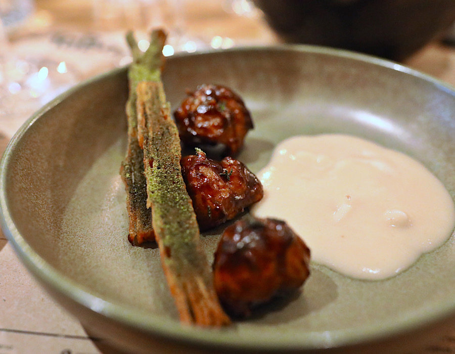 Mi smo naručili ukupno osam tapasa, što se pokazalo više nego dovoljnim. Tartar biftek imao je onu neusporedivu teksturu rukom sjeckanog svježeg mesa. Tartar se poslužuje s velikim slanim krekerom od heljde i loja, s aromatičnim jamarskim sirom i izvrsnim pireom od patlidžana. Pileći repovi glazirani u mizu od lješnjaka s umakom od kapelungi tipičan su primjer Pintarovog interesa za podcijenjene sastojke koje afirmira preciznim tehničkim kuhanjem (meso je bilo istodobno čvrsto i posve meko) i kombinacijama okusa (piletina i krumpir uz morski combo algi i školjki).