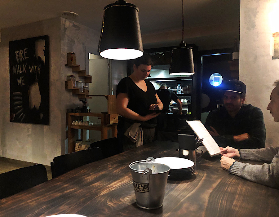 Vina se toče u čaše za vodu bez stalka, baš kao u starinskim gostionama. Gosti sjede za komunalnim drvenim stolovima, na kojima se nalaze beštek, limeni tanjuri i najjeftinije papirnate salvete. Hrana dolazi na stol bez minimalnog objašnjenja o čemu se radi. Konobarica stavi tanjur pred vas i ode.