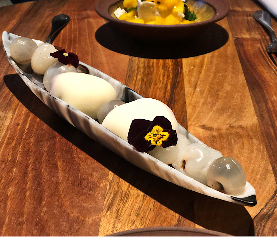 Tartar biftek s kamenicom serviran u gustom zabajonu s fermentiranom sojom i morskim travama, idealan je primjer modernog kinesko europskog fusiona. Slatko mesne jakovske kapice (kao da su se pekle na svinjskoj masti), s mekano hrskavim lignjama u sweet and sour umaku, raskošna su posveta tradicionalnoj kineskoj kuhinji: kiselina u sweet and sour dolazila je iz citrusa, koji su okruživali lignje i školjke. Slijedio je školski pečeni brancin (hrskava kora, čvrsto ali mekano meso) s komadićima crnih tartufa, raviolima s gljivama, i sirovim portobello gljivama. Začini u raviolu dali su kineski karakter ovom tipičnom francuskom jelu.