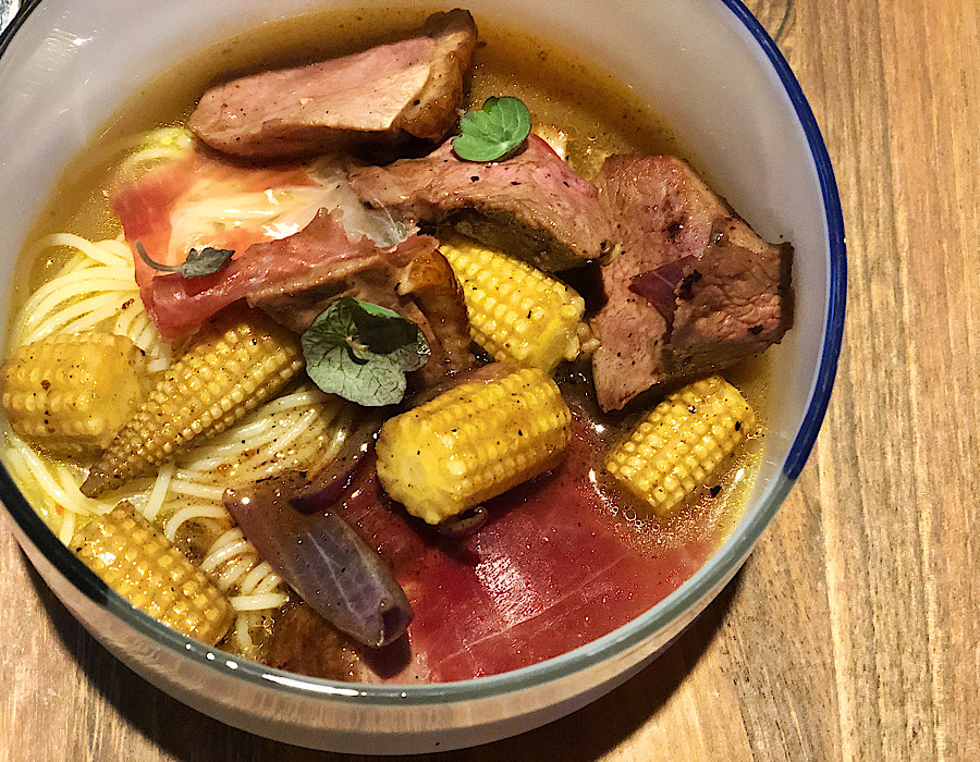 Patka sa staklenim rezancima i bebi kukuruzom, opet prepuna đumbira i korijandera, imala je onaj težak, opori okus prave kineske patke s puno masnoće, dok je sama juha, u kojoj su se kupali rezanci, bila fenomenalno bogata i potpuno adiktivna.