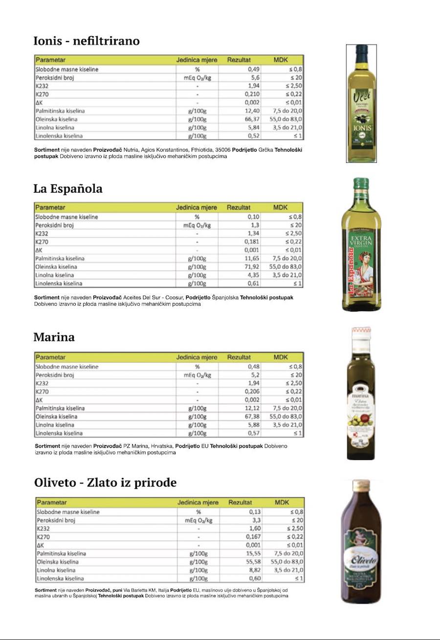 Analizirali smo i dva ulja naših većih proizvođača koji na svojim etiketama za zemlju podrijetla navode EU, a ne Hrvatsku. Što je u najmanju ruku čudno, jer Hrvatska je maslinarska zemlja i proizvodimo maslinovo ulje. Zanimljivo je da su po sastavima masnih kiselina ona približno ista, a po oleinskoj masnoj kiselini i identična španjolskim uljima, što bi moglo značiti da su porijeklom iz Španjolske.