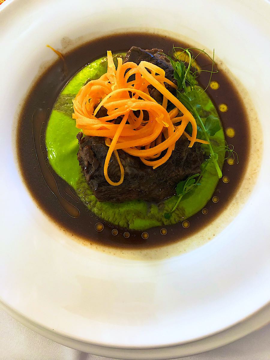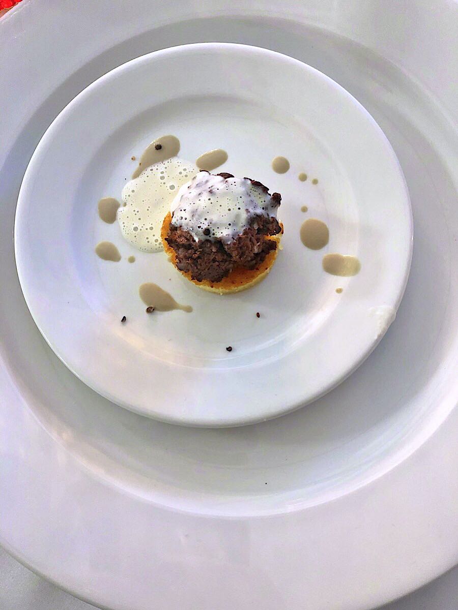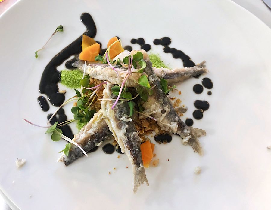 Večera je počela pozdravom iz kuhinje, zlevkom s tartarom o krvavice i pjenicom o hrena uz koji je poslužena Matoševićeva Alba iz 2018. Vrlo dobre srdele na savor sa sipom i ukiseljenom mrkvom koje je s ekipom UNUO-a pripremao Dario Bionda, pratila je Medeina malvazija Montiron iz 2018.
