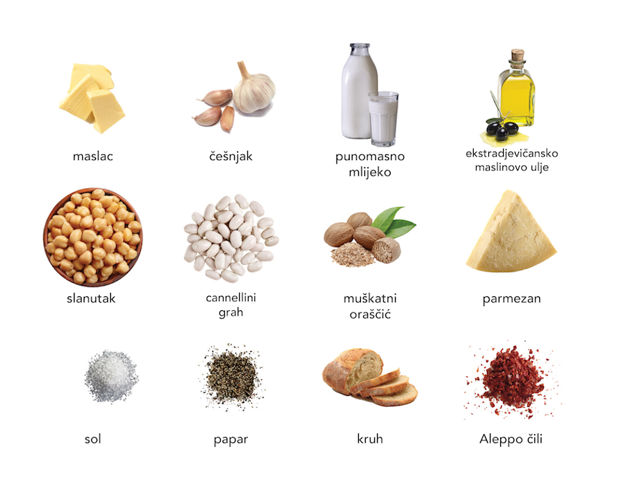Sve za ovo jednostavno elegantno jelo kojemu dodatnu dimenziju daju kremasta tekstura i karamelizirani češnjak, vjerojatno već imate u kuhinji. Ako vam se ne da namakati i kuhati slanutak i grah, možete koristiti konzerve. Važno je koristiti punomasno mlijeko, a u umak možete dodavati razno svježe začinsko bilje i lisnato povrće poput blitve ili rikule. Ne štedite na parmezanu, obavezno ga naribajte u zadnji čas, koristite neko intenzivno, aromatično vrhunsko maslinovo ulje, a ljutinu čilija prilagodite svom ukusu. Recept