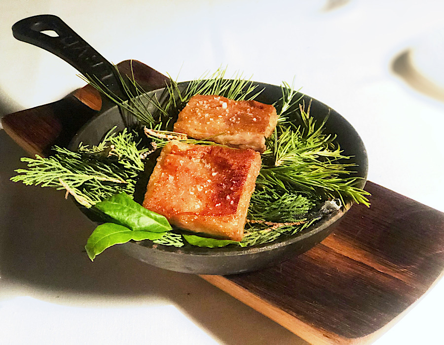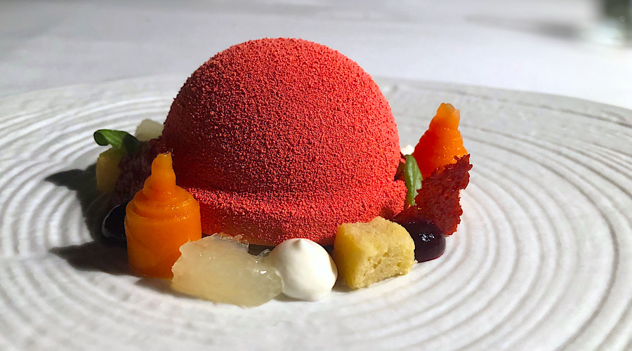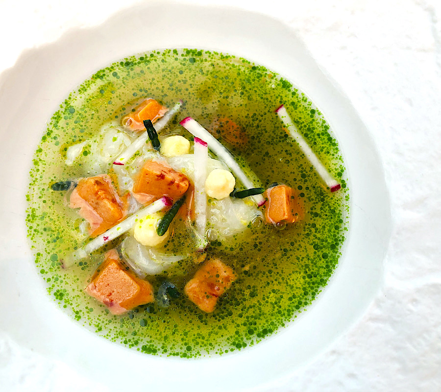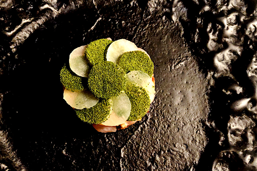 Degustacijski meni od dvanaestak jela, računajući amuse bouche i petit fours, počinje izvrsnim krekerima od lokalnog samoniklog bilja s pjenicom od samoniklog bilja i ječmenim kašom. Tu su još i jako ukusne lanjske “masline”s vermutom i kuglice punjene shotom od povrća.