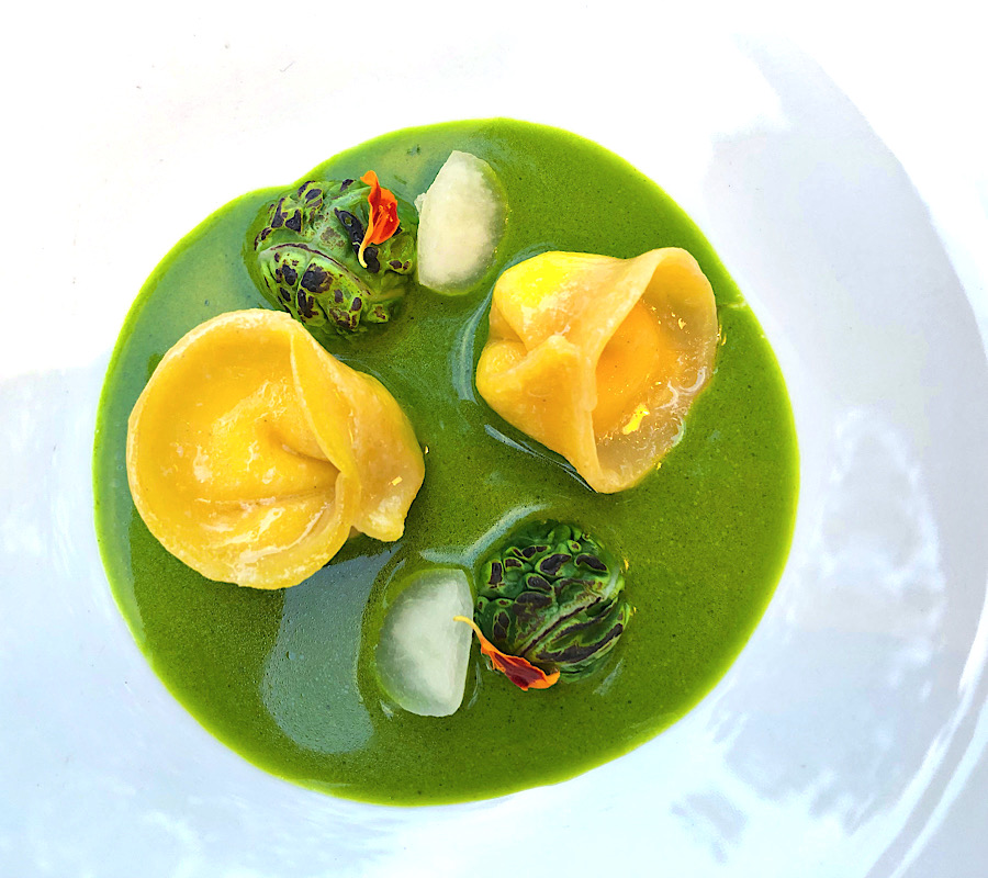 Pannacotta od ježinca sa sirovim lignjama i dashijem izvrsno je ujedinila mineralnost ježinca, umami dashija i slasnost mekanog, gotovo živog mesa liganja, dok su tortelini sa skutom i sušenim janjećim srcem još jedna žešća, tvrđa posveta otoku.