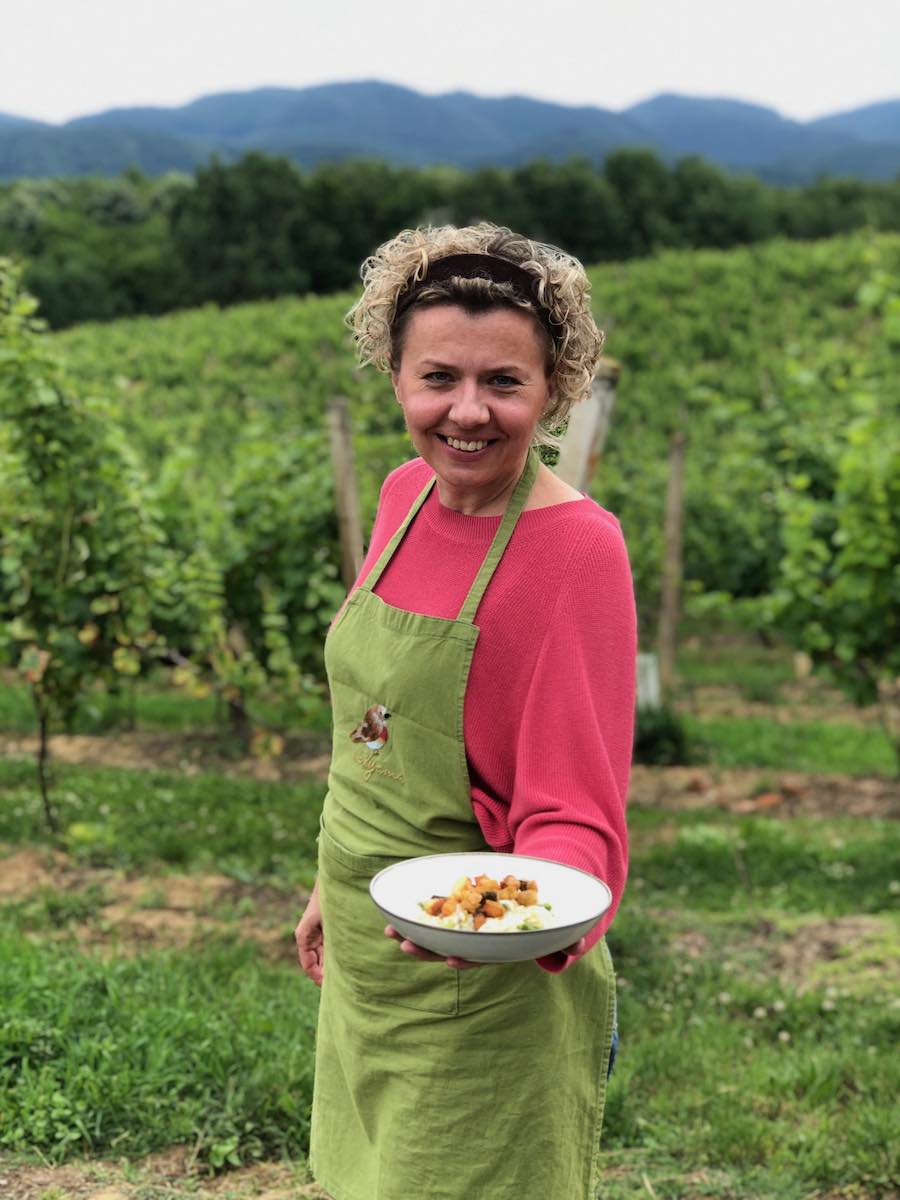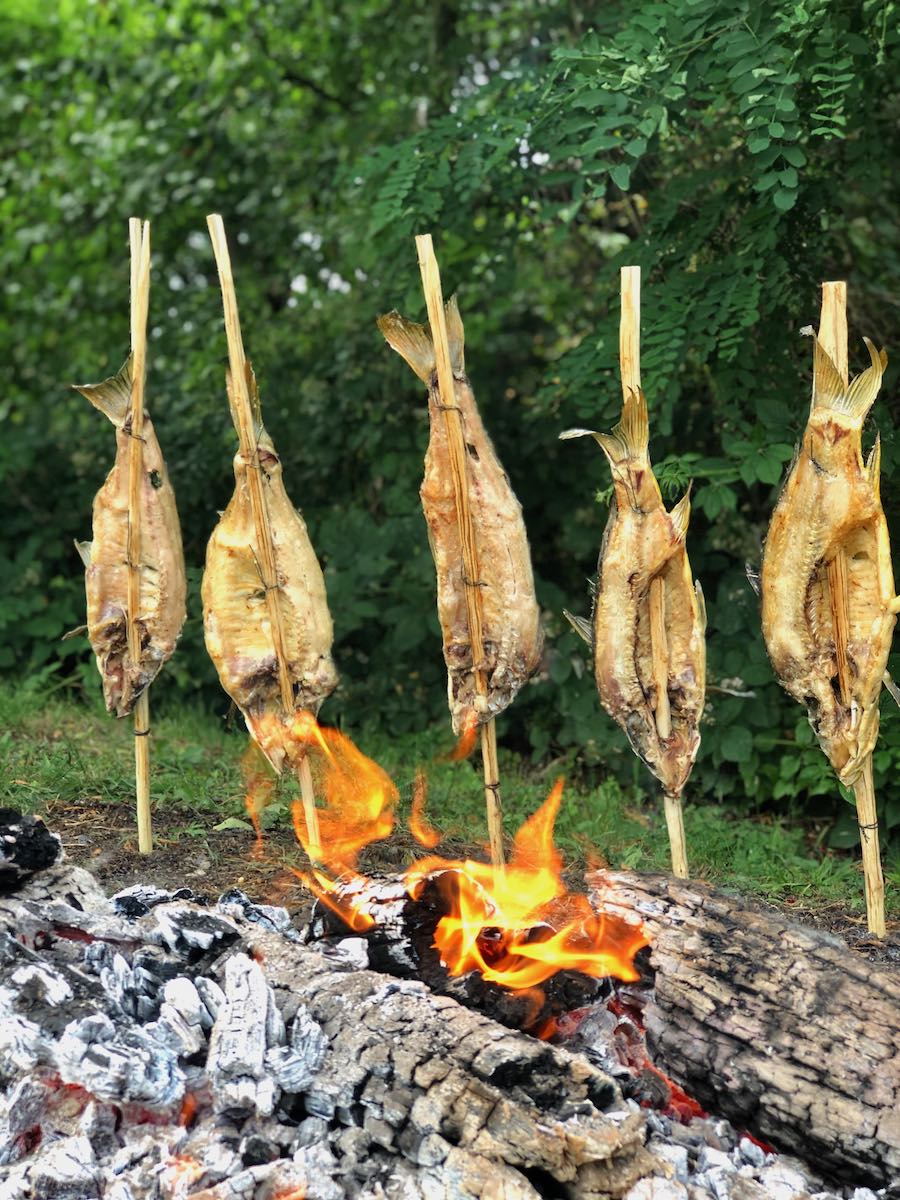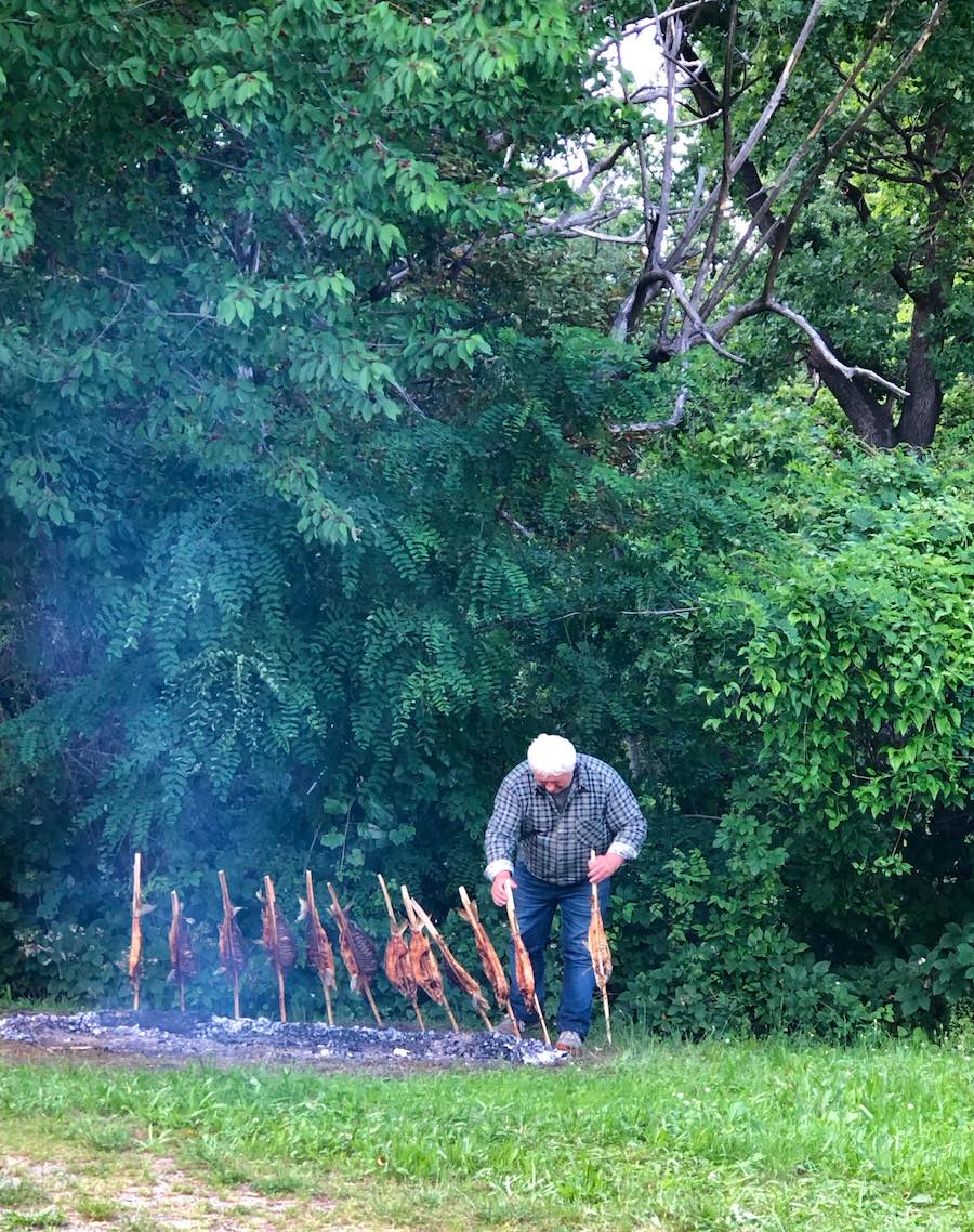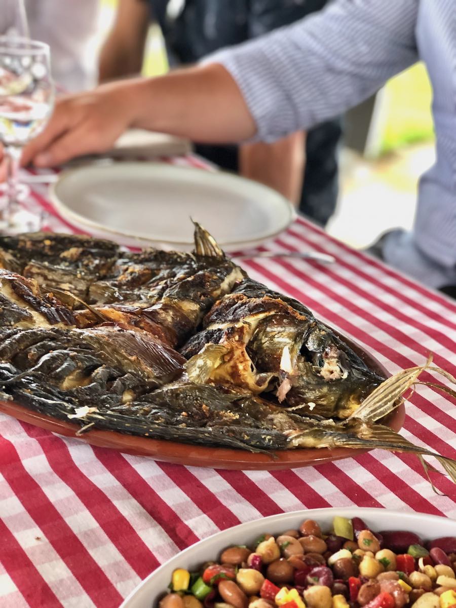Poslije kušanja u podrumu otišli smo na ručak u vinograd Jezerac, gdje smo, na rubu šume pod trešnjama zatekli sedam ili osam šarana na rašljama. Šarani su se dugo pekli, masnoća se rastopila, a meso je poprimilo nježnu, skoro pahuljastu teksturu i finu aromu dima. Šaran je prepun kostiju, ali to je viša sila. Kao predjelo, Maja Božičanin pripremila nam je neku vrstu tartara od dimljenog šarana koji je bio restoranski vrijedan.